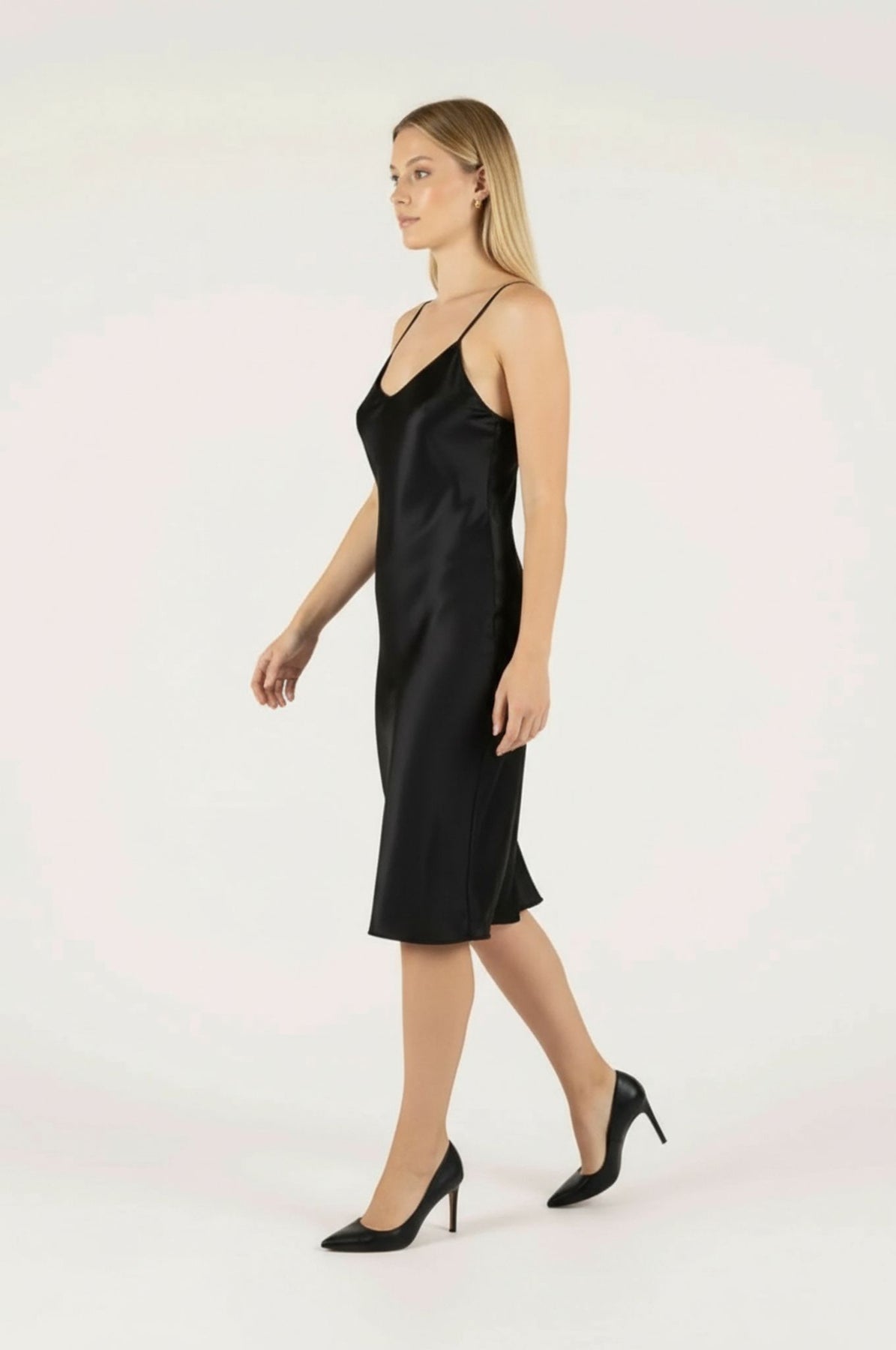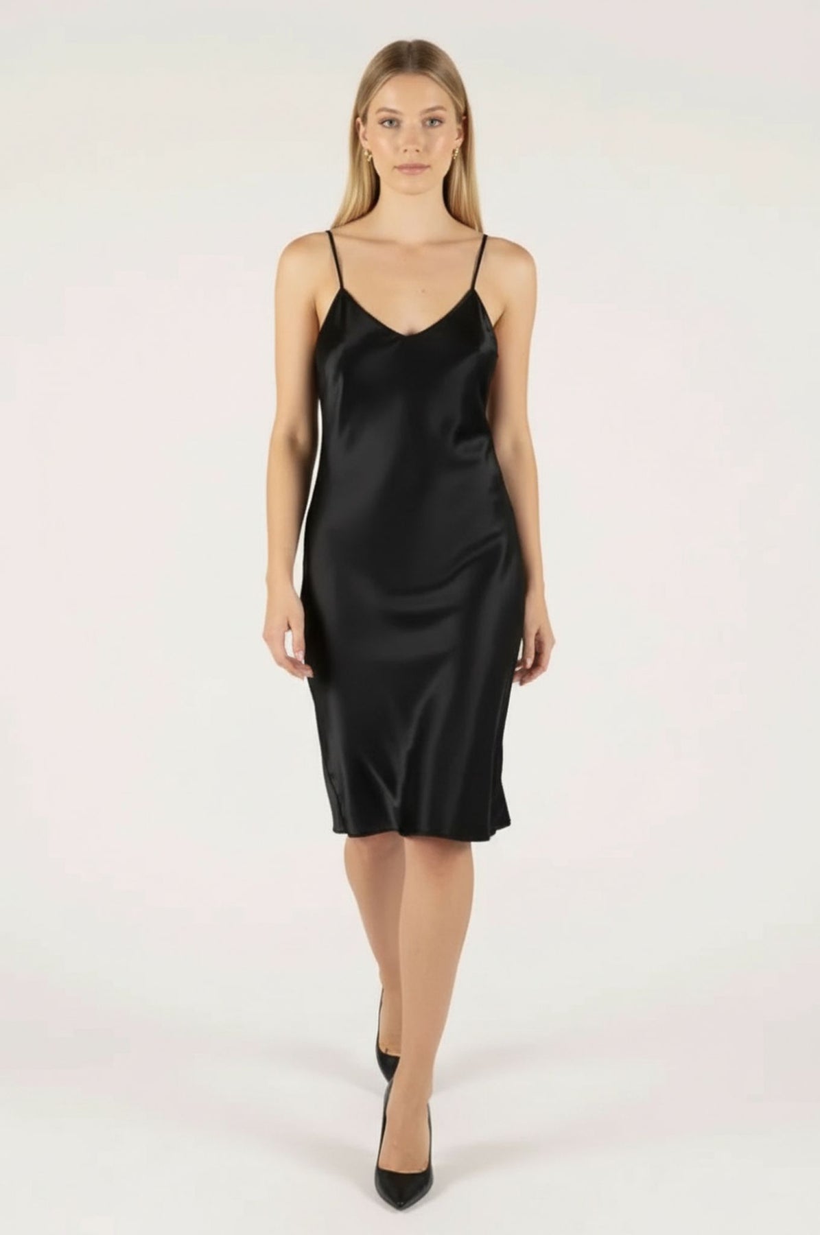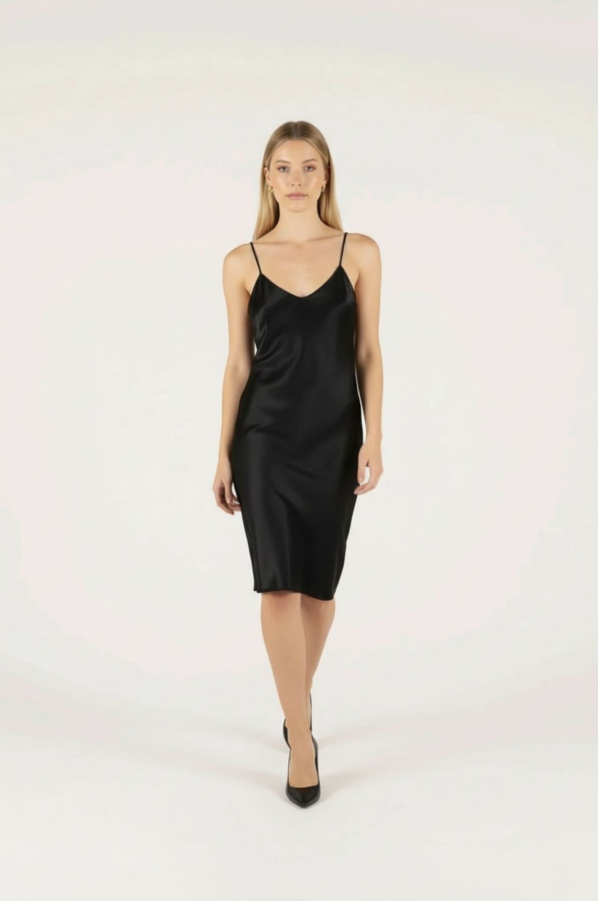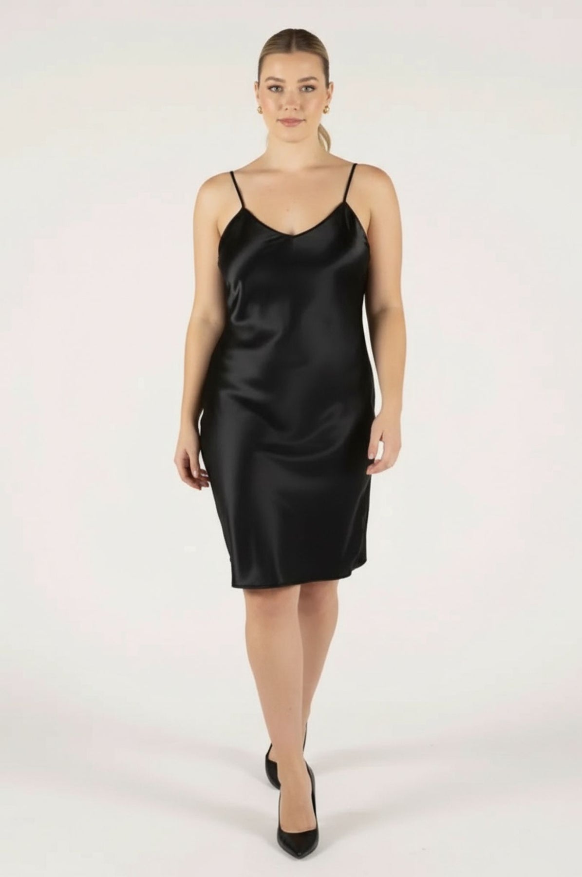 Slip into sophistication with our black satin chemise, designed to bring a touch of luxury comfort to your wardrobe. Cut on the bias, it skims the body with a fluid, flattering drape that feels effortless. Lightweight yet refined, it transitions seamlessly from evening lounge piece to the perfect smoothing layer beneath your favorite dresses. Wear it as a nightie or as a short slip for added smoothness under your favorite dresses.