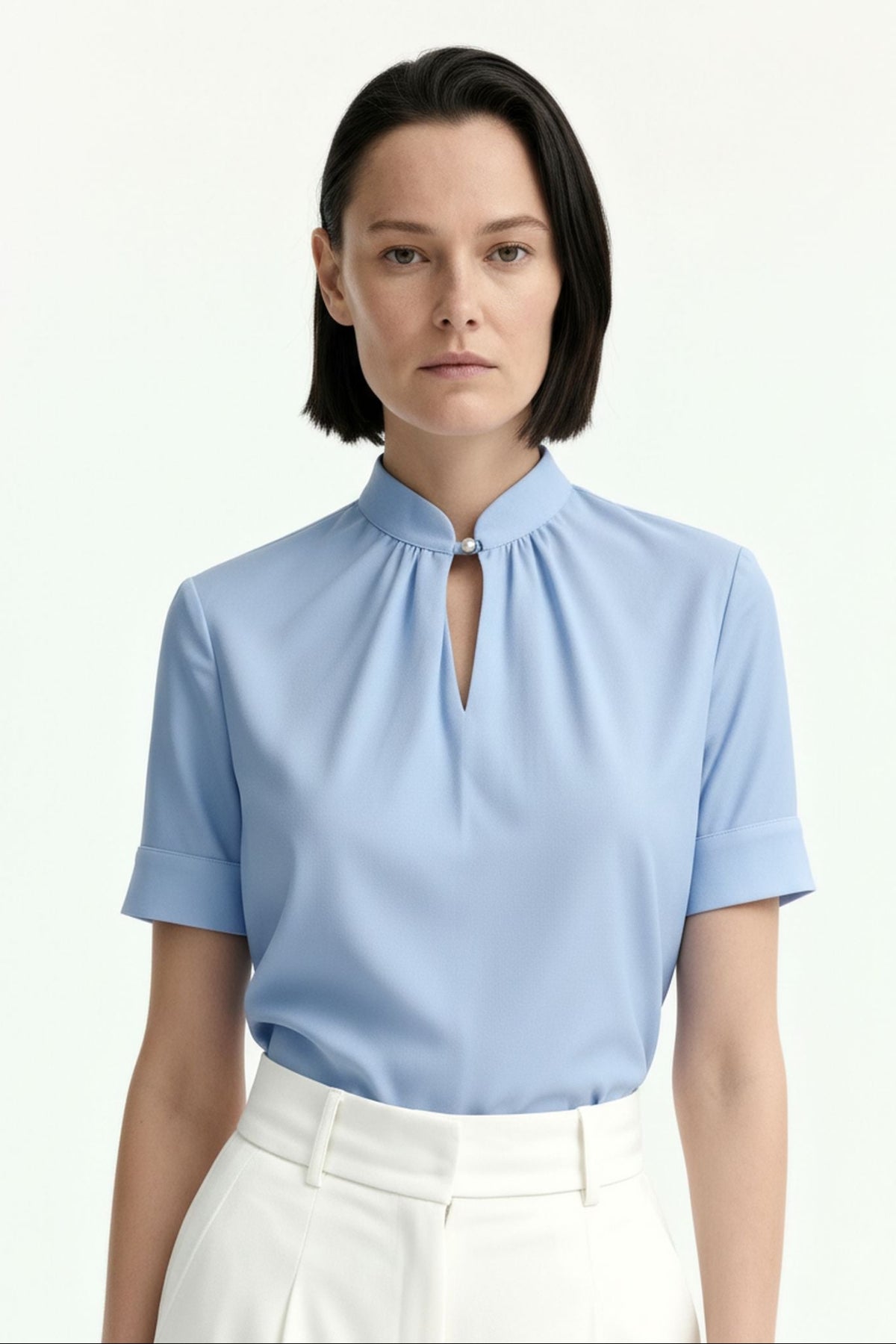 Woman wearing a light blue shirt and white pants on a white background
