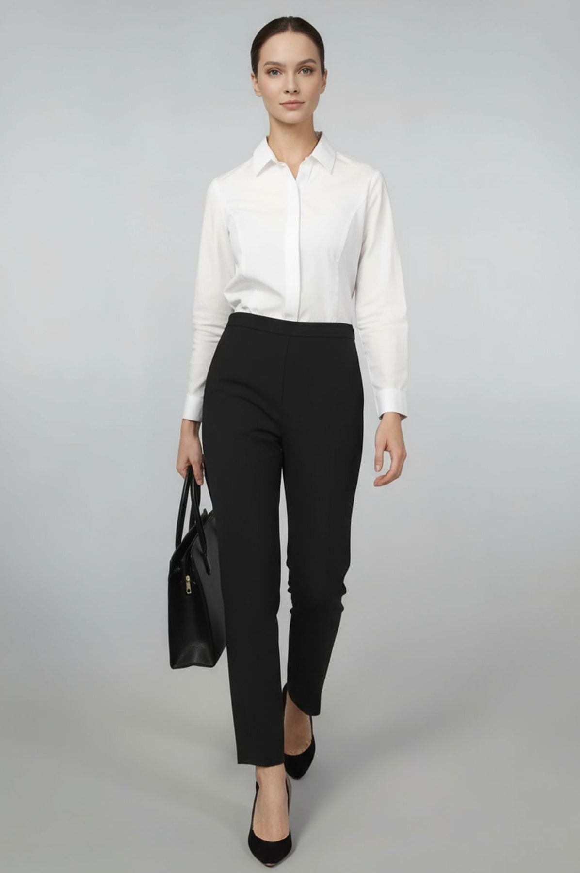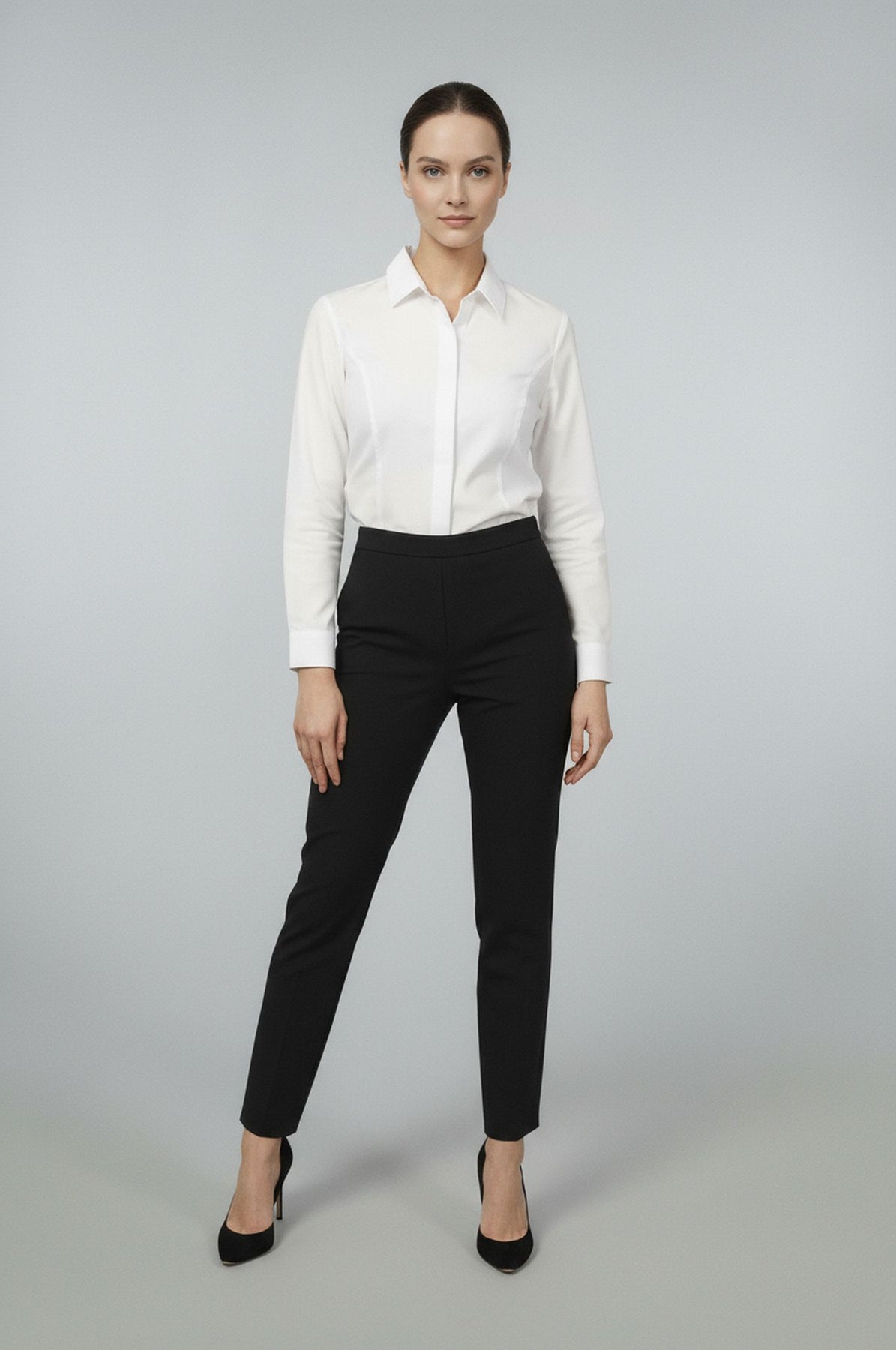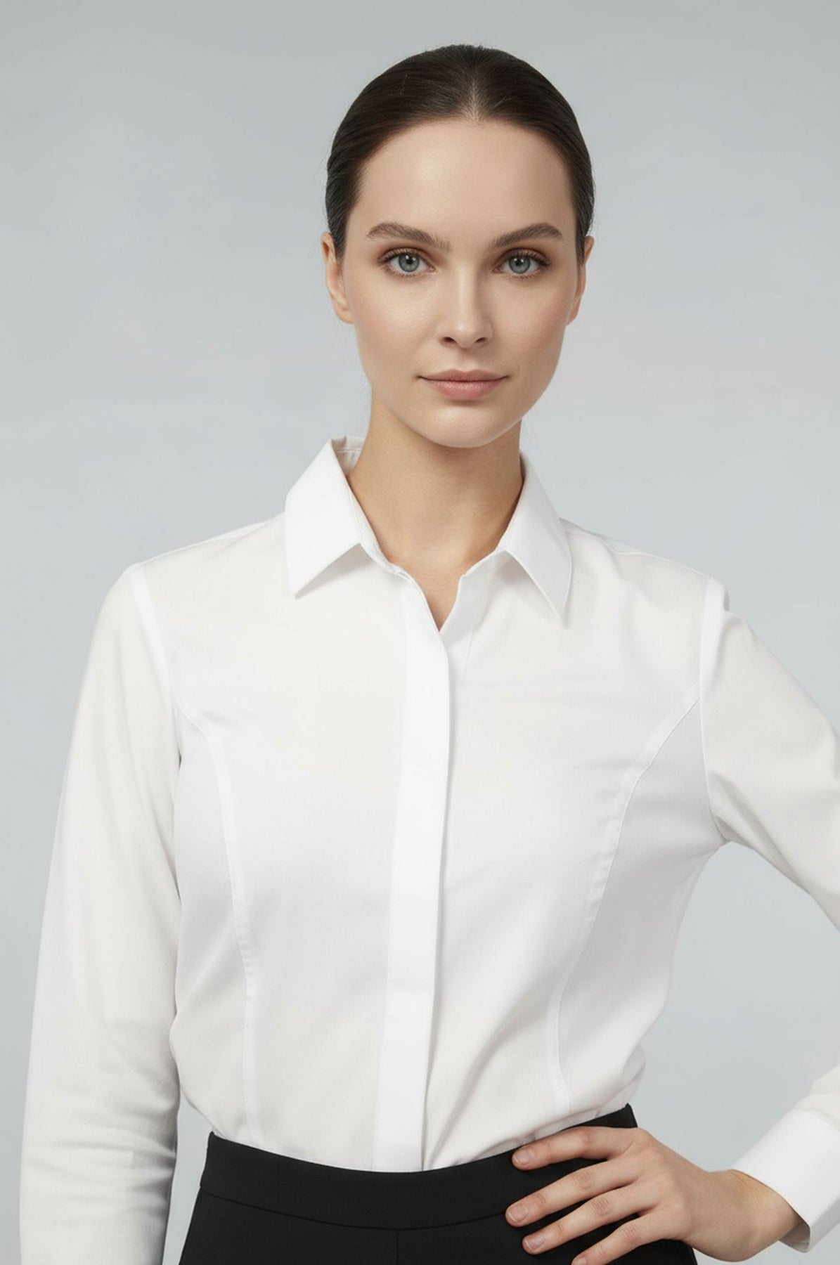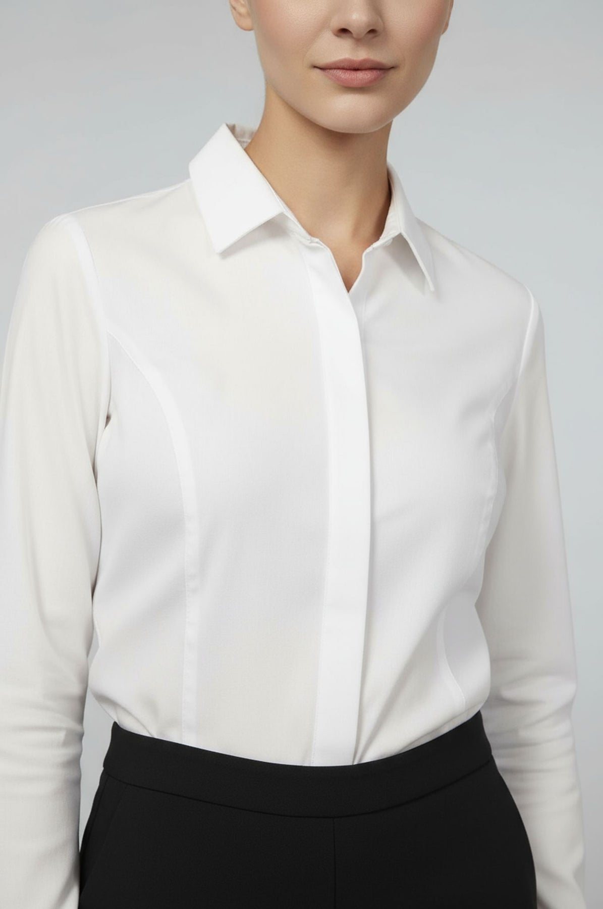 This ultra high performance, wrinkle resistant blouse won't untuck as you move throughout your day. The Jetset Bodysuit features a high amount of stretch, sweat stainproof material, and a beautiful front no-gape button placket. The best part? The blouse is completely opaque - so you can wear your favorite undergarments without worry.