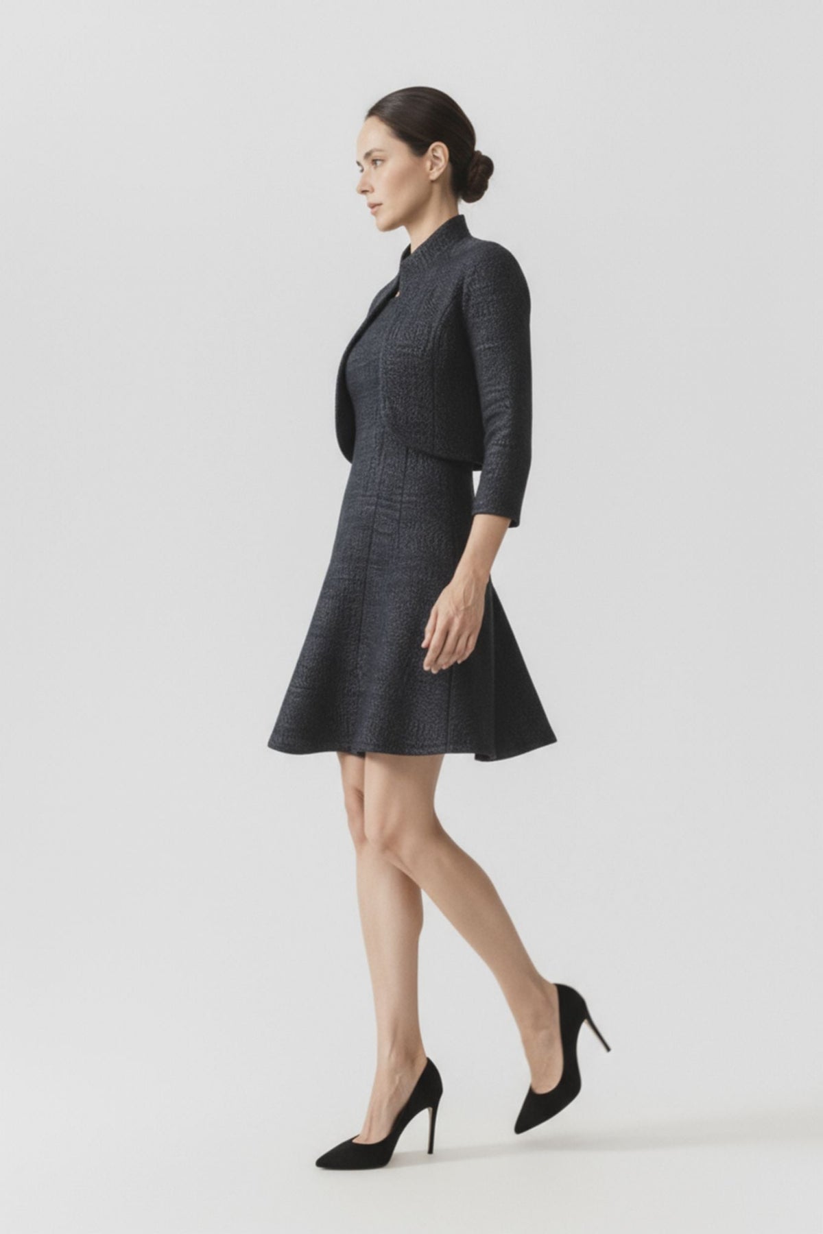 Woman wearing a dark gray dress with a matching jacket on a light gray background