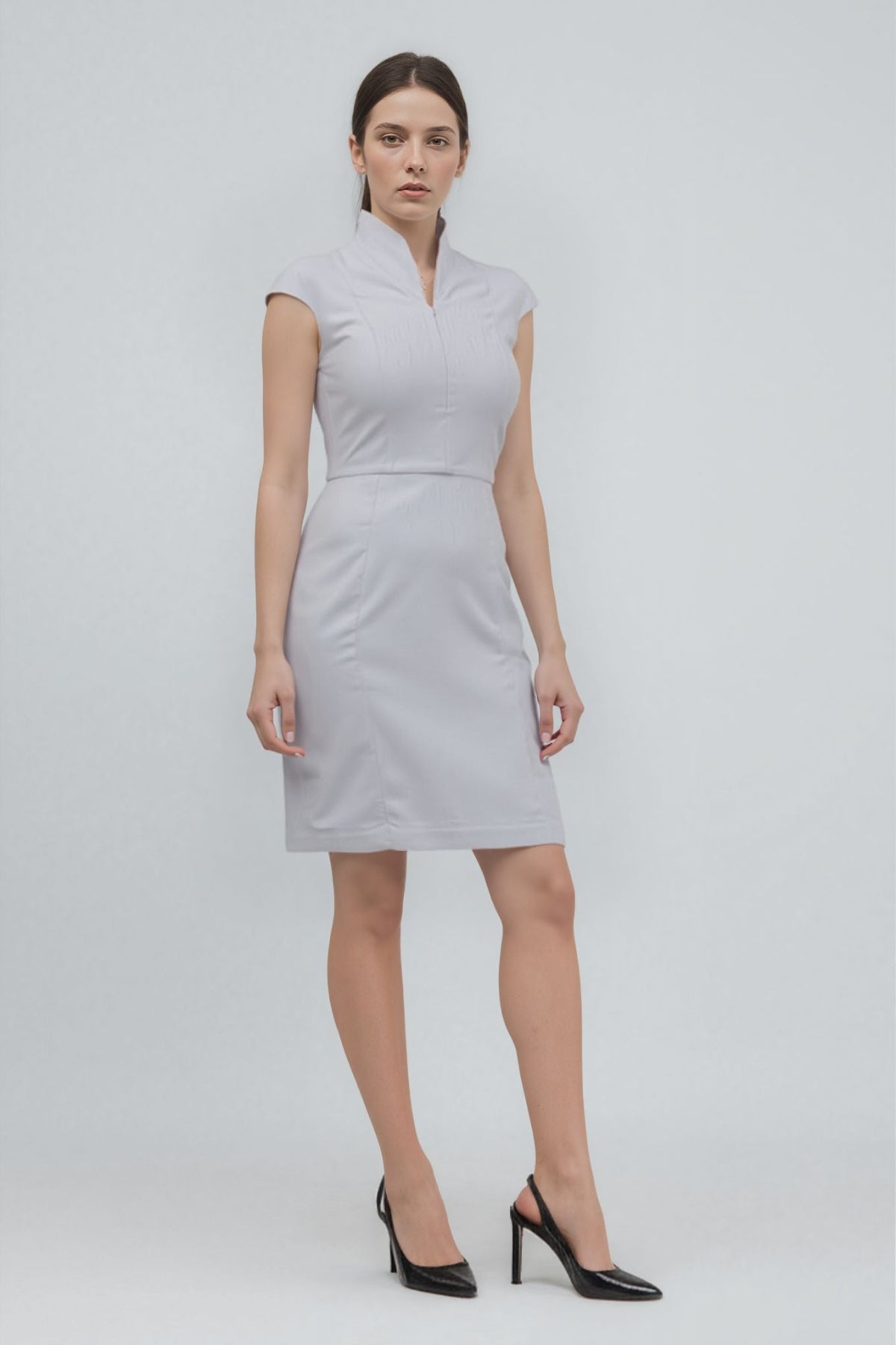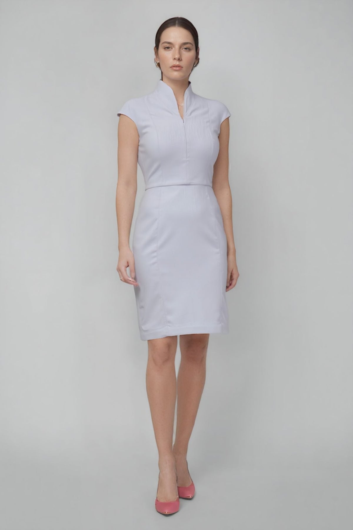 Princess seams, a standing collar and front zipper combine forces to be the ultimate power dress. The Evelyn has been the on-camera look of choice for news anchors and public figures for years. Upgrade your look with this new novelty material for the spring limited collection.