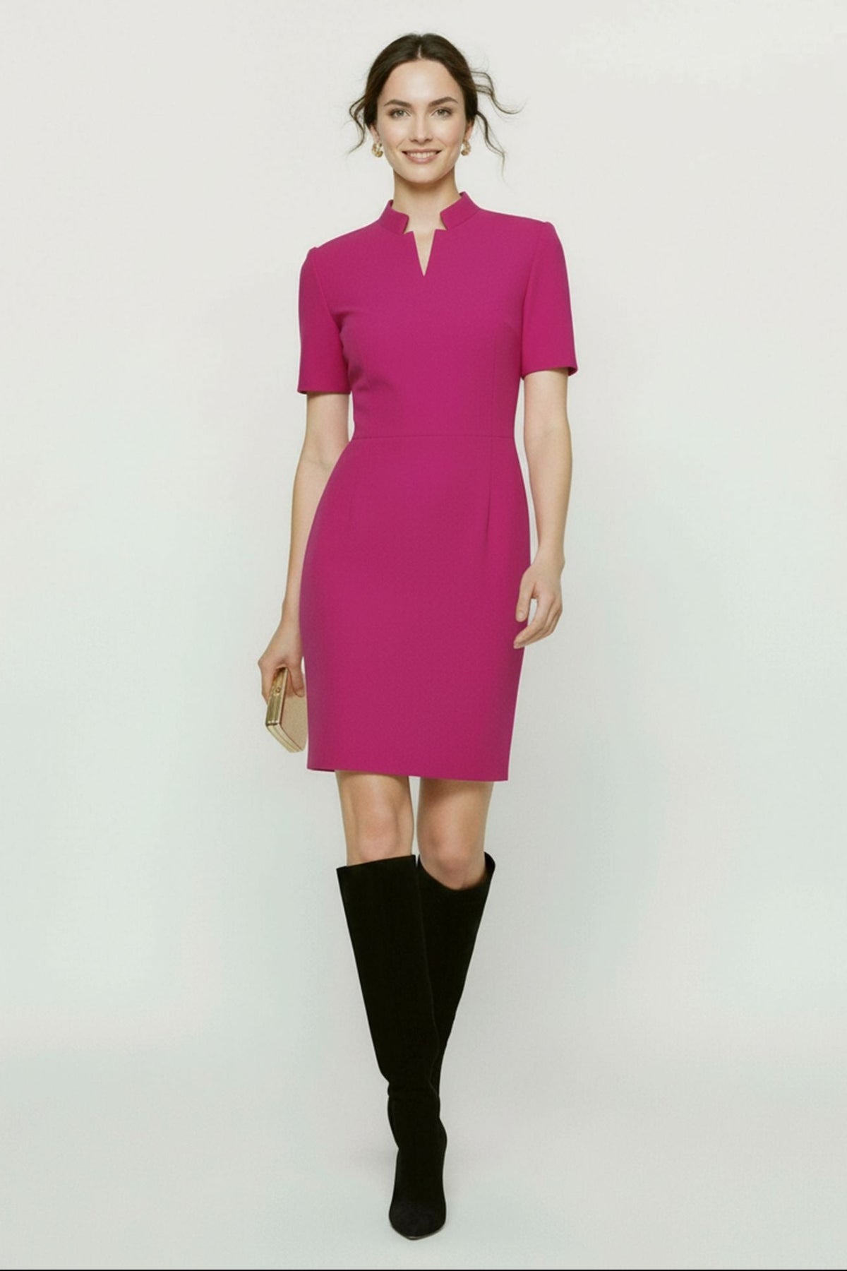 Based on the best selling silhouette of the Sleeved Evelyn Dress, the Sarah features a perfectly fitted notched collar. Both stylish and formal, this dress is endlessly versatile and perfect for any occasion. Pair it with the Alanna Blazer for a business formal look.